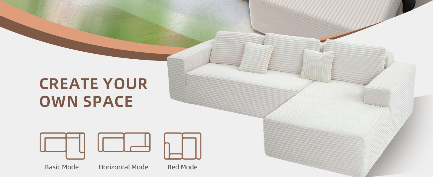 Modular Versatility: This cloud sectional couch features two detachable sections that allow flexible reconfiguration into an L-shape layout. maximizing living room space utilization while ensuring perfect compatibility with your home’s interior arrangement.